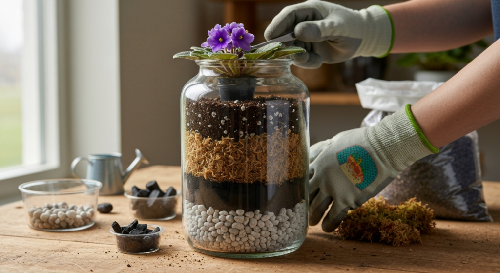 Plant selection matters more than most people think. Choose plants that are already healthy and actively growing. Stressed plants rarely recover in the transition to terrarium life. If you’re using a blooming plant, pick one with several unopened buds rather than one in full bloom—the new flowers will develop adapted to the jar environment.