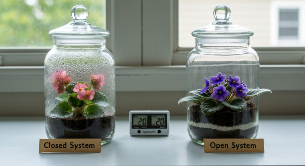 Most people assume closed is always better because it requires less maintenance. That’s only partially true. Closed systems work for plants that naturally grow in constantly moist environments, but many flowering houseplants need some air movement to prevent their blooms from rotting.