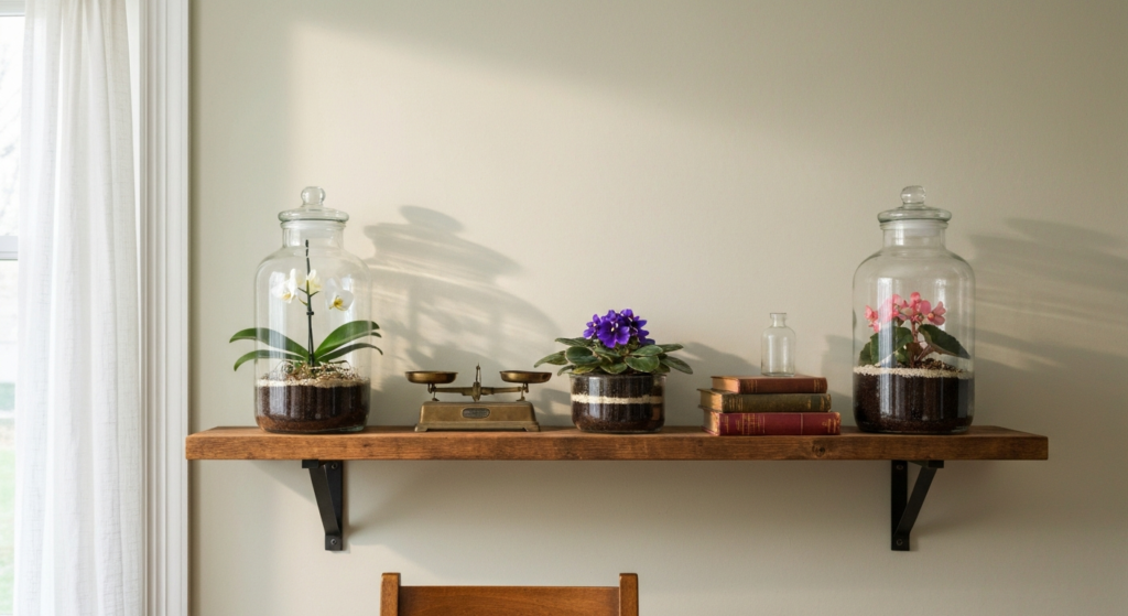 I placed three different-sized jars on a floating shelf in my kitchen. Each held a different flowering plant—African violet, episcia, and a small begonia. The varying heights created rhythm, and the morning light coming through the window made the glass glow. That simple arrangement got more comments from visitors than any other plant display I’ve created.