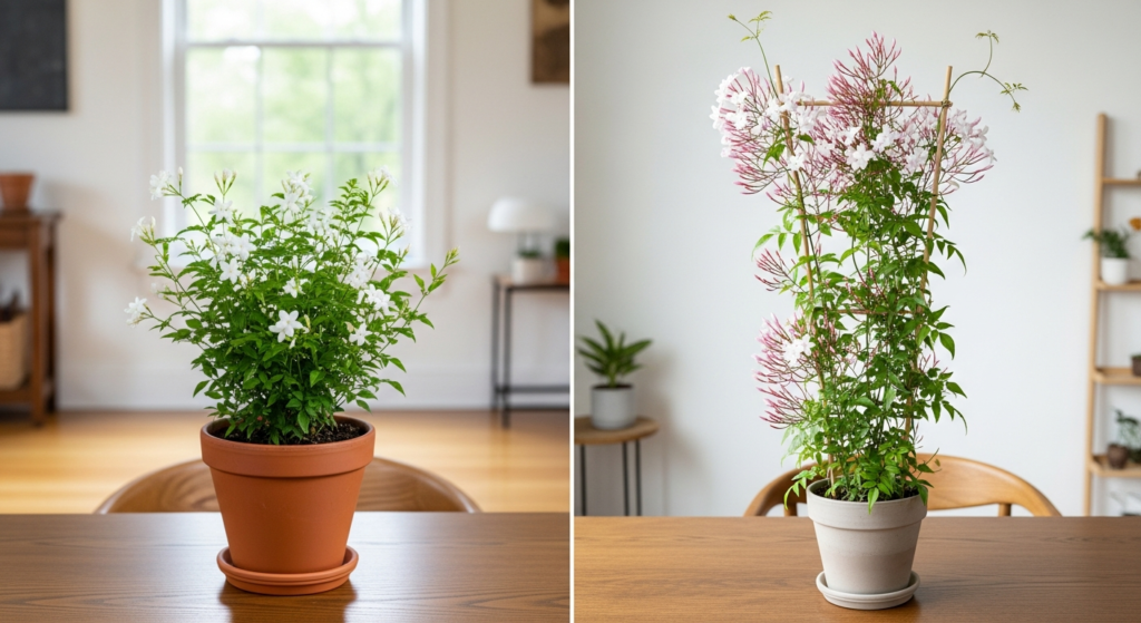 I learned this distinction the hard way. My first J. polyanthum went into a 6-inch pot on a small trellis. Within six months, it had outgrown three successive pots and toppled two support structures. I eventually moved it to a 16-inch floor pot with a 6-foot trellis, where it finally had room to grow properly.