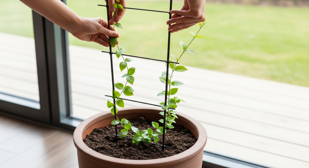 For dwarf varieties like J. sambac, a simple bamboo tripod or small wire cage works fine. Push three 2-foot bamboo stakes into the soil around the pot’s edge, tie them together at the top, and you have enough support for the plant’s modest climbing tendency.