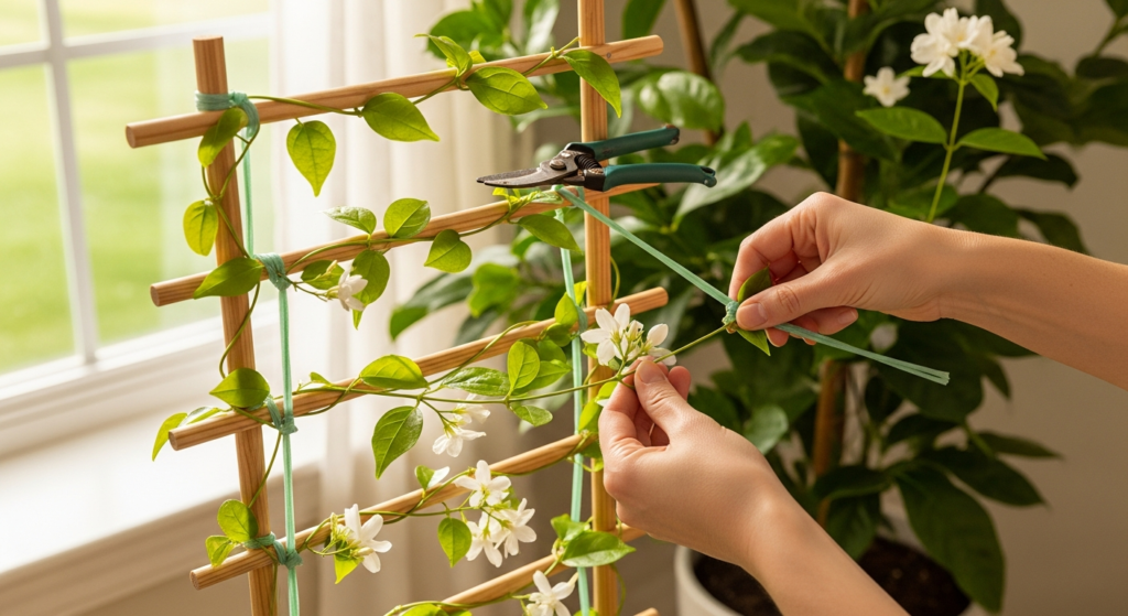 Vining types need something substantial. I use freestanding trellises for my floor plants—wooden or metal frames that sit in or behind the pot. The trellis should be at least as tall as you want the plant to grow, with horizontal crossbars every 8-12 inches. Jasmine vines wrap around supports as they grow, but they need those horizontal elements to grab onto.