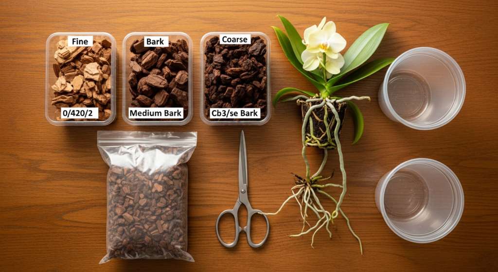 For small and mini Phalaenopsis, use fine to medium bark. The smaller bark pieces fit better in small pots and hold a bit more moisture, which helps smaller plants that dry out faster.